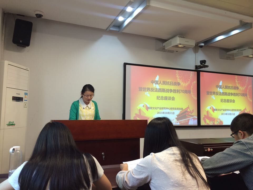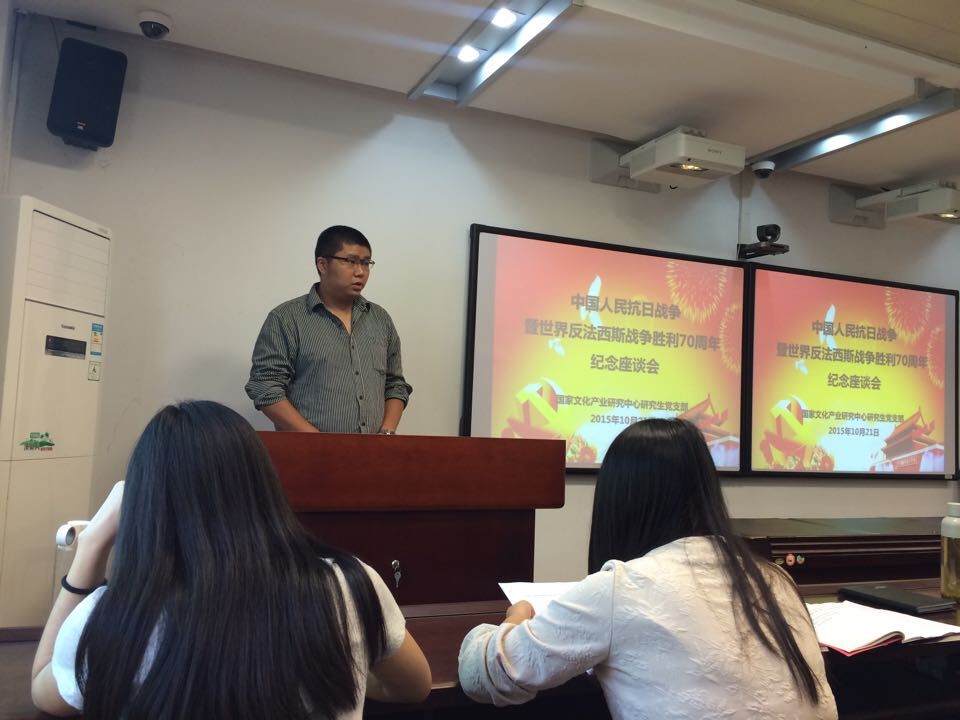 2015年10月21日下午,中心研究生党支部于318报告厅召开了中国人民抗日战争暨世界反法西斯战争胜利70周年纪念座谈会。座谈会由中心研究生党支部书记郑文覃主持,中心党政综合办公室主任徐金龙老师、翟艺琳老师出席了本次座谈会。