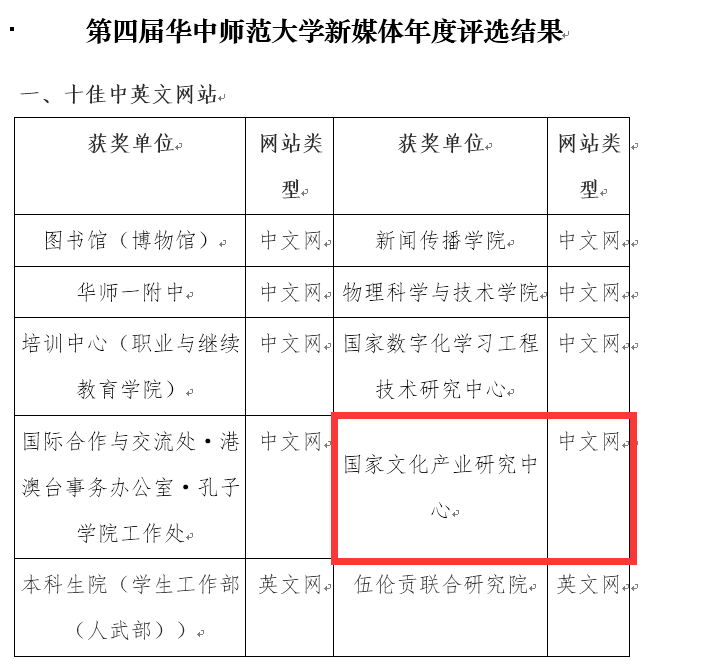 2018华中师范大学新媒体年度评选活动于2018年12月中旬正式启动,经过初选提名、微信投票以及专家终评三个阶段,华中师范大学国家文化产业研究中心官网喜获华中师范大学2018年度“十佳中英文网站”荣誉称号。