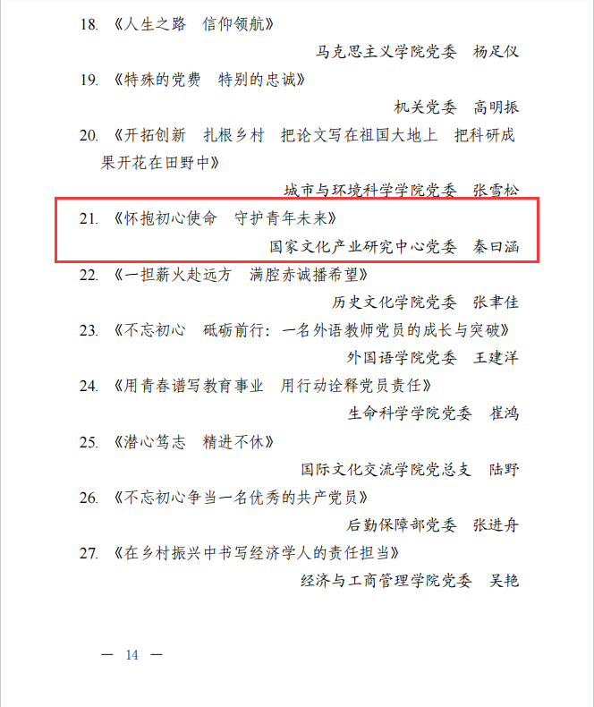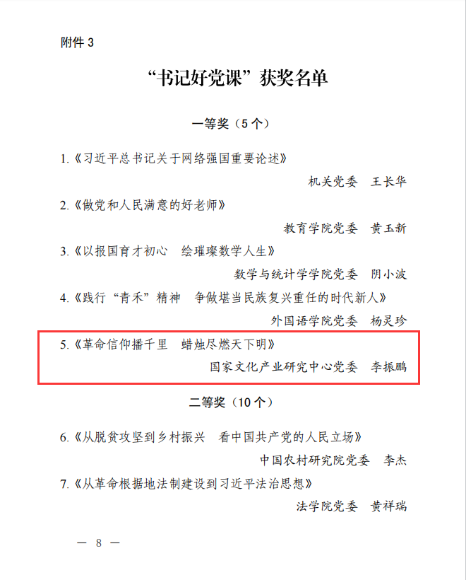 近日,学校党委对本次展评活动的获奖情况进行通报。中心2020级研究生党支部书记李振鹏同志主讲的《革命信仰播千里 蜡烛尽燃天下明》微党课获全校“书记好党课”一等奖,讲述中心研究生辅导员秦曰涵同志事迹的《怀抱初心使命 守护青年未来》获全校“党员好故事”三等奖!