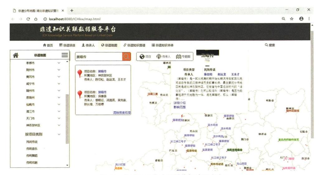 除了将非遗知识以关联图谱的形式进行可视化之外, 还可以借助地理信息系统 (GIS) 以在线地图的形式展示非遗知识中的地理特征。通过与GeoNames数据库关联以及利用地理编码技术获取非遗项目或传承人实体的经纬度信息, 在基础地图服务的基础上实现非遗知识地图可视化。图13是非遗地图可视化界面, 页面左侧按照行政区划与项目类型提供分类导航;此外, 提供地图查询功能, 查询结果将在地图中标记出来, 点击地图上的兴趣点可以查看详细信息。以地理空间为主线, 以非遗领域知识为对象, 将领域知识围绕地理特征进行汇聚与组织, 从而实现非遗知识服务的智慧化系统。