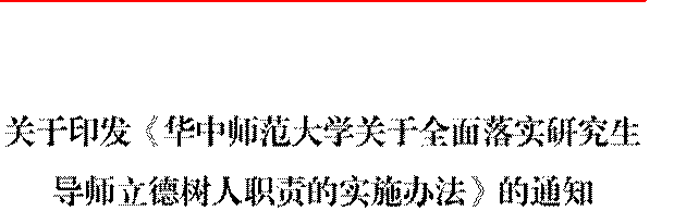 为进一步把全国高校思想政治工作会议和全国教育大会精神贯彻落实引向深入,努力造就一支有理想信念、有道德情操、有扎实学识、有仁爱之心的研究生导师队伍,根据《中国人民共和国教师法》《中共中央国务院关于全面深化新时代教师队伍建设改革的意见》《新时代高校教师职业行为十项准则》《教育部关于全面落实研究生导师立德树人职责的意见》等文件精神,结合我校研究生教育实际,特制定《华中师范大学关于全面落实研究生导师立德树人职责的实施办法》,经学校 2019 年第 7 次党委常委会会议审议通过,现予以印发,请遵照执行。