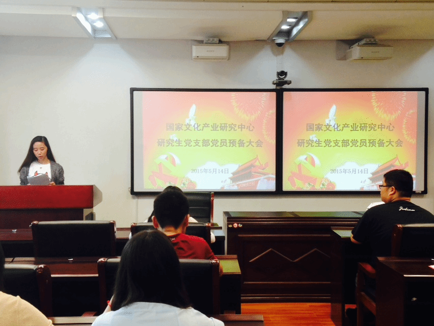 2015年5月14日, 国家文化产业研究中心研究生党支部在中心318会议室召开中心研究生党支部党员预备大会, 此次会议由中心研究生党支部副书记何华丽同志主持,参加此次会议的是中心研究生21名党员同志和三名发展对象同志:夏雪同志、蔡爽同志和文立杰同志。会议开始,中心研究生党支部副书记何华丽同志简要介绍了大会的流程以及发展预备党员的程序,依次按照了以下六个流程进行:入党申请人宣读入党志愿书、介绍人介绍申请人的主要情况、支委代表张恒同志向支部大会介绍申请人的政审情况、与会党员发表意见、入党申请人对大会讨论情况表明自己的态度、正式党员举手表决。