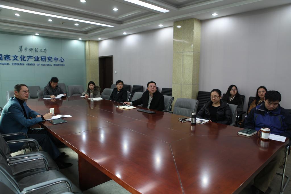 会议开始,詹一虹主任向李征院长表示了热烈欢迎,然后从学科建设、人才培养、平台建设、科研成果及社会服务等几方面对中心进行了较为详细的介绍,并特别展示了所完成的文化科技融合成果和文化产品,如针灸铜人、数字东湖、孔子的故事、工艺美术博览城项目等。随后,李征院长表示听完深受启发,并对孔子学院情况做了简要介绍,谈到该校与华师交流合作密切并已签署备忘录,希望今后能与中心在文化产业领域有更多合作。