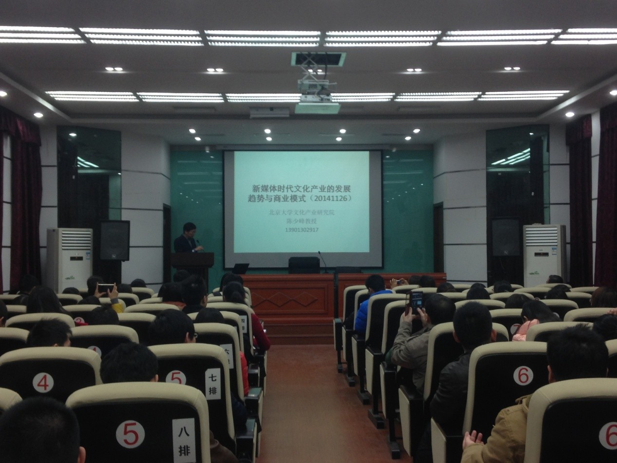 12月6日晚,由国家文化产业研究中心举办的第八期“华文讲坛”在我校研究生报告厅圆满举行。北京大学哲学系教授、博士生导师,文化产业研究院副院长陈少峰教授作了题为“新媒体时代文化产业的发展趋势与商业模式”的精彩讲座,中心为陈少峰教授颁发了主讲人聘书。