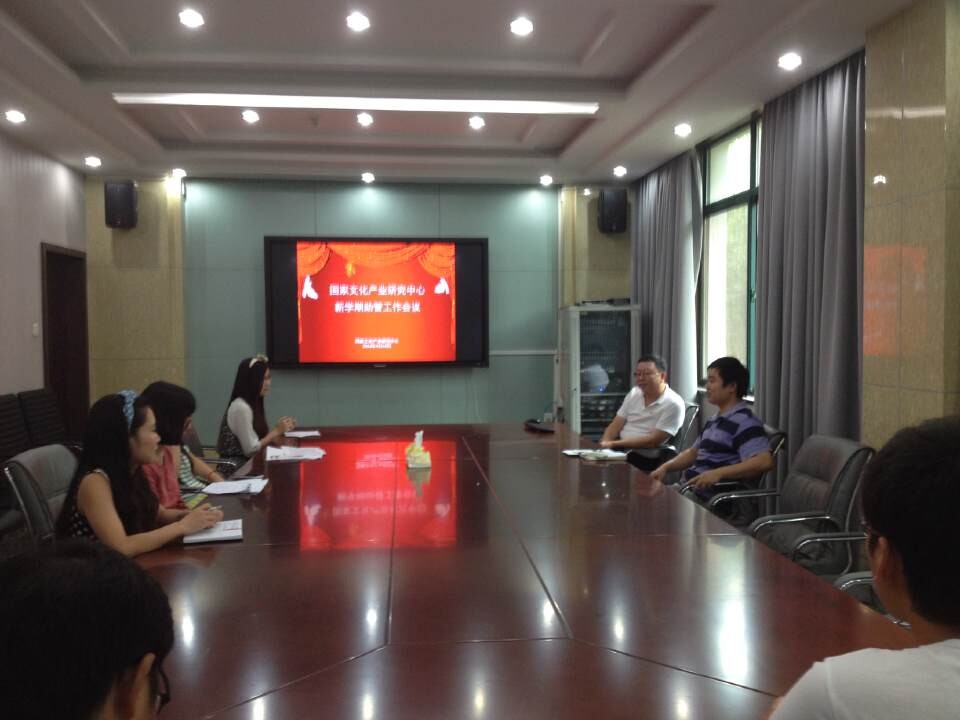 2014年9月15日上午10点,国家文化产业研究中心助管团队在换届招新之后,在305会议室召开了第一次新老成员见面交流会。参加本次会议的有常务副主任詹一虹教授,党政综合管理办公室主任徐金龙博士,上届成员肖静可、陶慧、韩愈霞、陆芸芸、赵阳,以及新一届成员龙婷、刘晨晨、王贵军。上一届成员肖静可、赵阳留任,肖静可继续担任助管团主管。