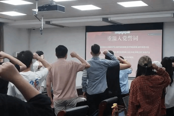 会上,全体参会人员起立齐唱国歌并重温入党誓词。