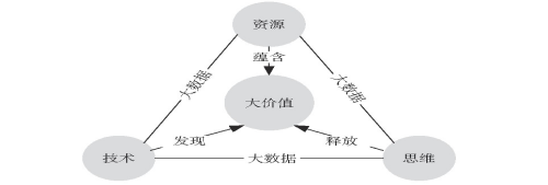 如何认识“大数据”?不同的领域有不同的认识视角。最早提出“大数据”一词的是著名未来学家托夫勒,他在1980年所著的《第三次浪潮》中热情地将“大数据”称颂为 “第三次浪潮的华彩乐章”。随后,美国国家航空航天局的研究人员迈克尔·科克斯(Michael Cox)和戴维·埃尔斯沃思(David Ellsworth)首次正式提出大数据概念及其存储所带来的被称之为“大数据问题”的问题[2],标志着大数据概念初步形成。从2008年开始,《自然》[3]和《科学》[4]期刊分别推出专刊,围绕科学研究中的大数据问题展开讨论,相继有麦肯锡(McKinsey)咨询公司大数据白皮书的发布[5]、达沃斯世界经济论坛[6]、联合国的“全球脉动(Global pulse)”计划[7]、美国的“大数据研究和发展倡议”[8]等,都开展了与大数据相关的项目与研究。至此,人们对大数据的认识也逐渐清晰。从目前的研究内涵来看,大数据主要包含大数据资源、大数据技术和大数据思维。大数据是一个“数据资源+先进技术+思维方式”的价值综合体,其价值实现模型如图1所示。