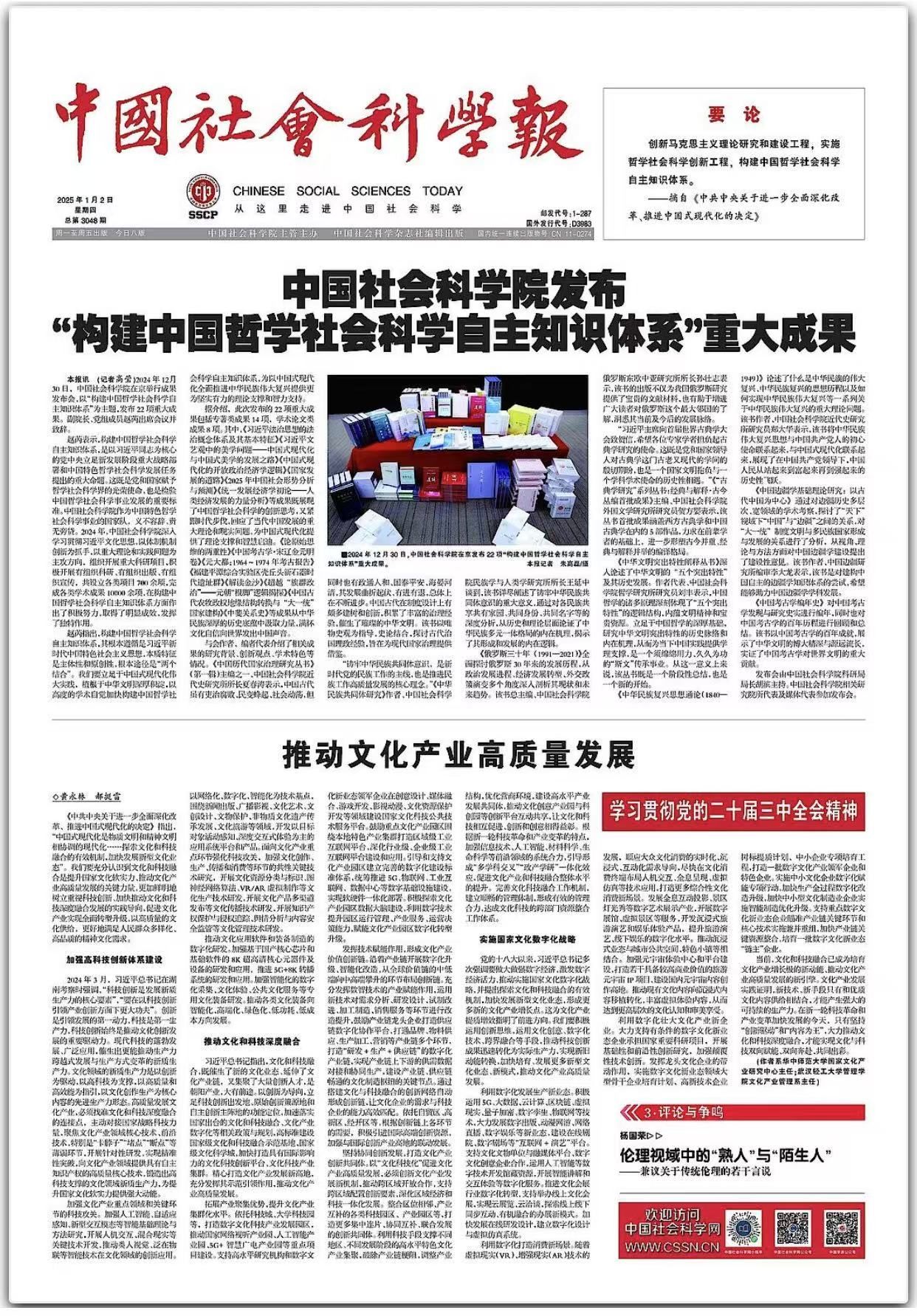 2025年1月2日,中心黄永林教授和武汉轻工大学郝挺雷副教授撰写的《推动文化产业高质量发展》理论文章在《中国社会科学报》新年第一期第一版发表。